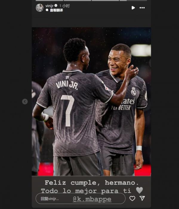 12月20日讯 姆巴佩在今日迎来26岁生日,队友维尼修斯通过社媒送上祝福。
